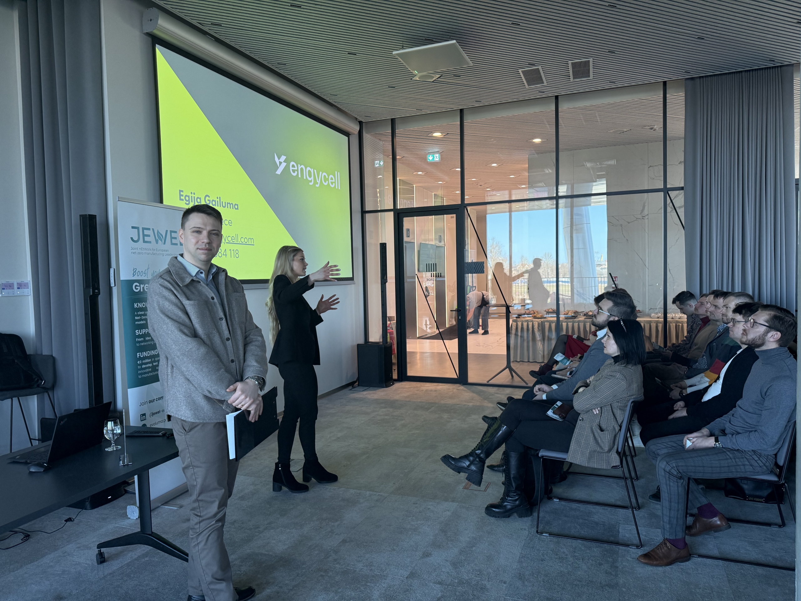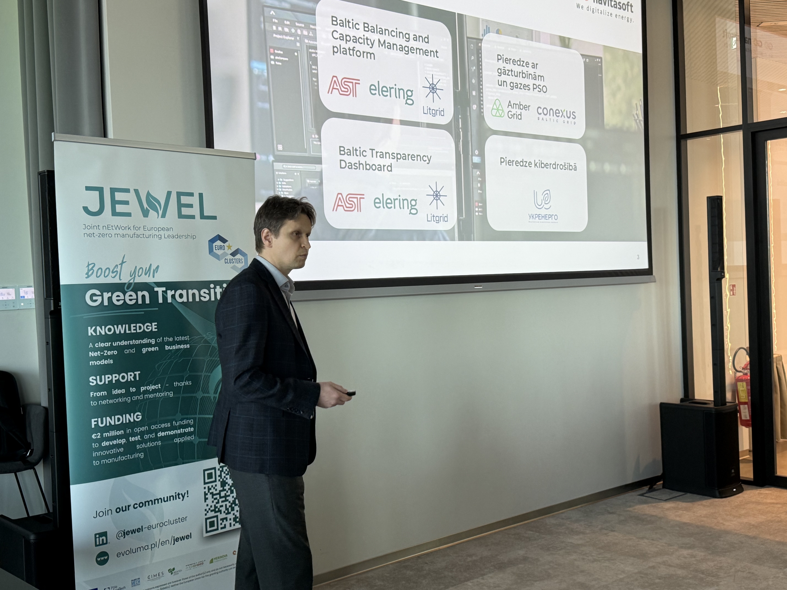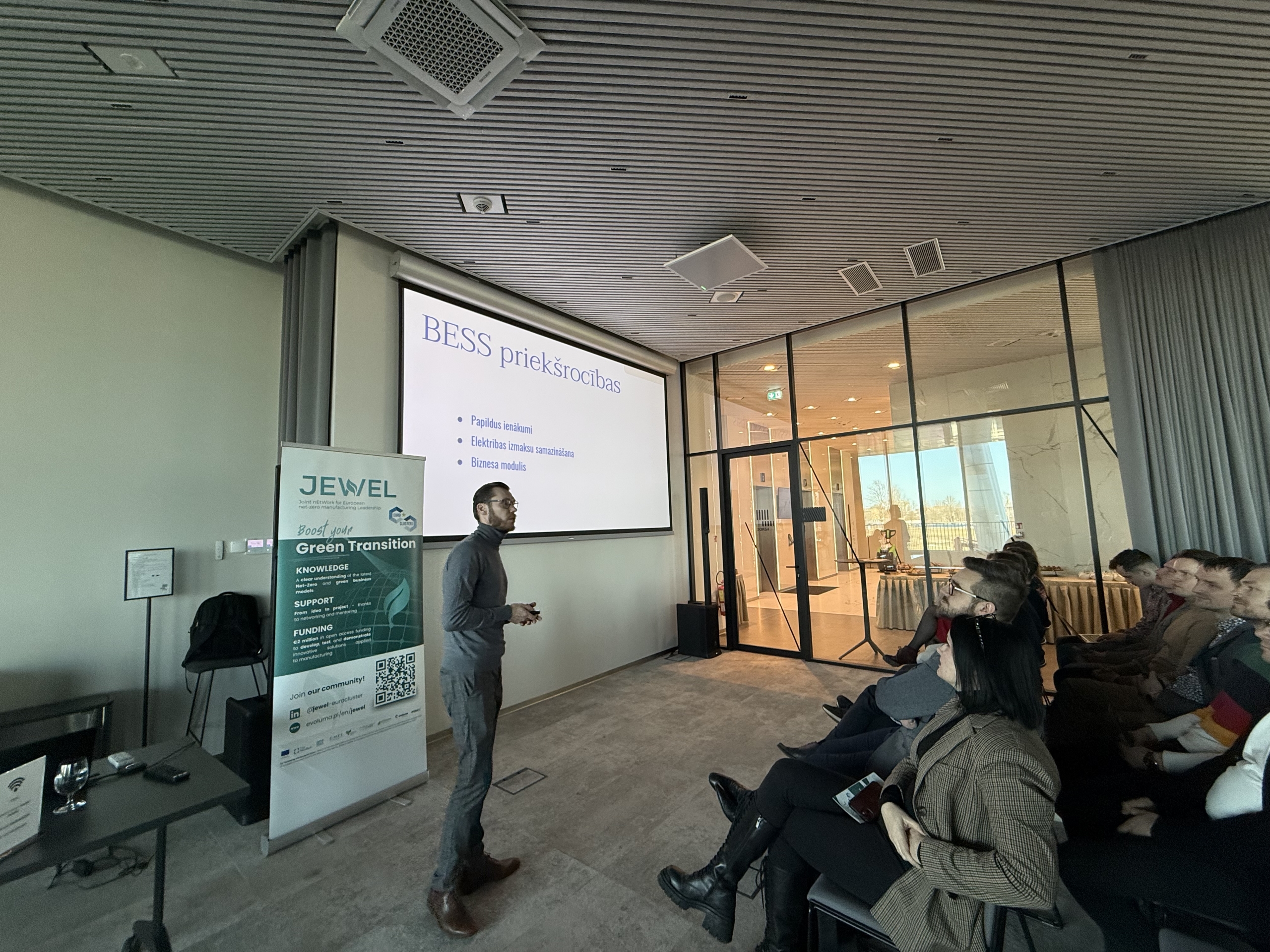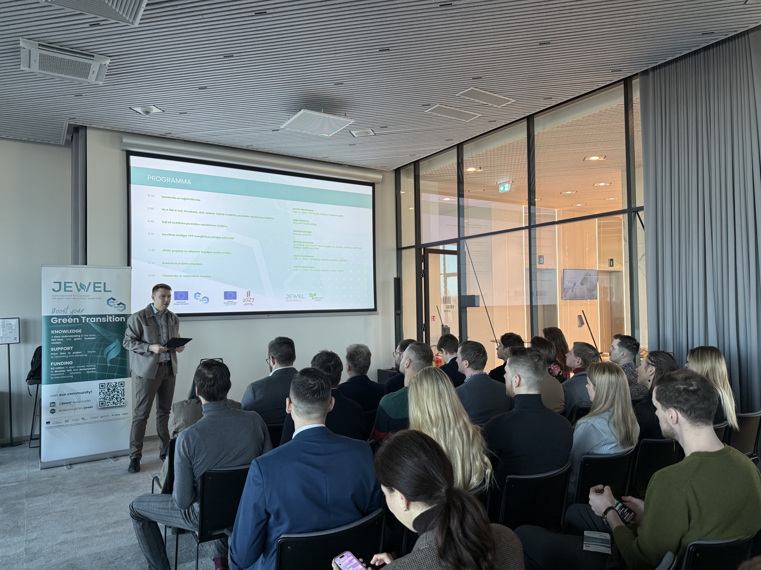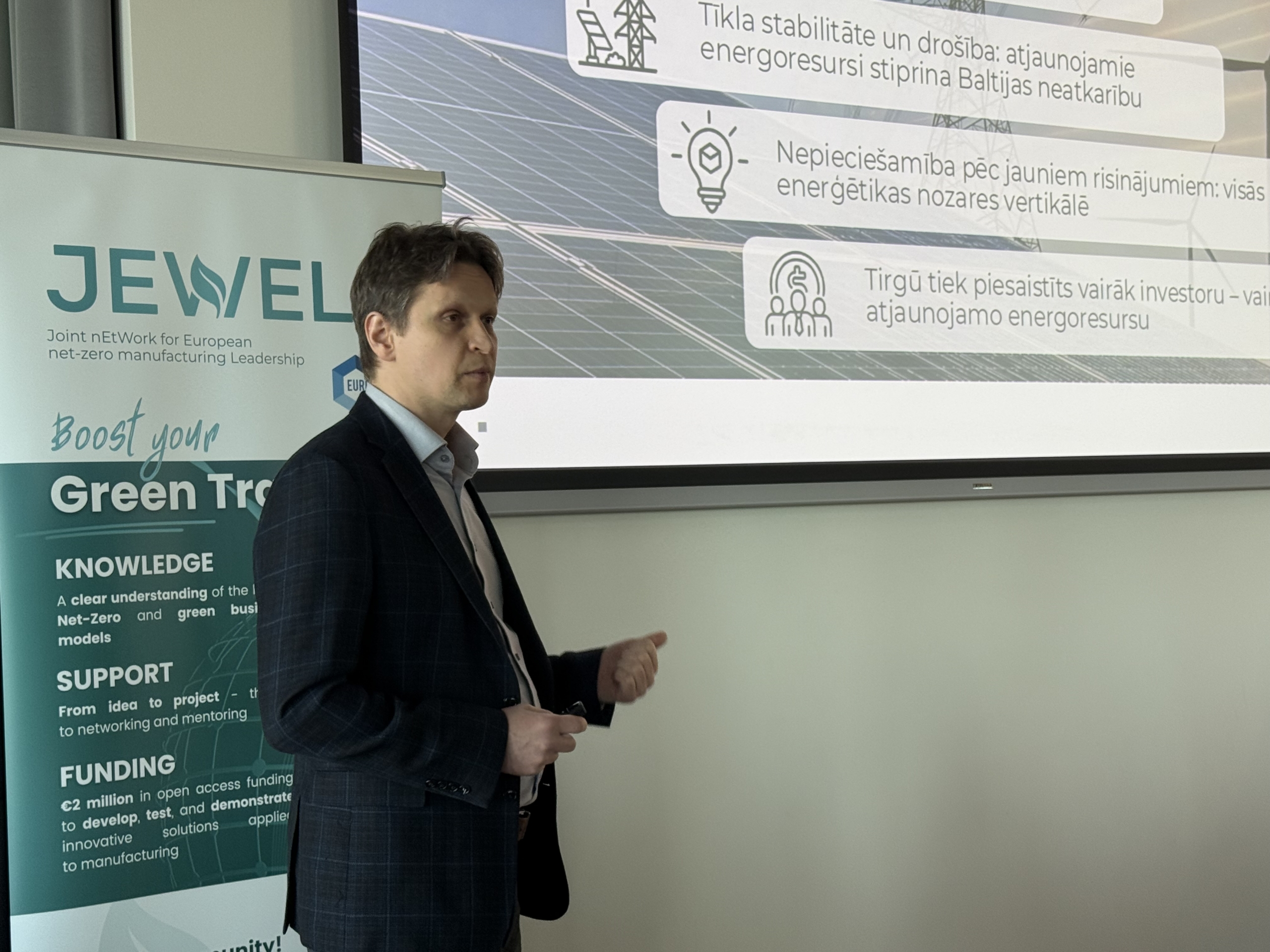 Tāpat tika prezentētas pieejamās atbalsta un finansējuma iespējas Eiropas projektu “JEWEL” un “Green Grid” ietvaros, kas veicina inovācijas, enerģijas risinājumus un klimatneitrālu attīstību.